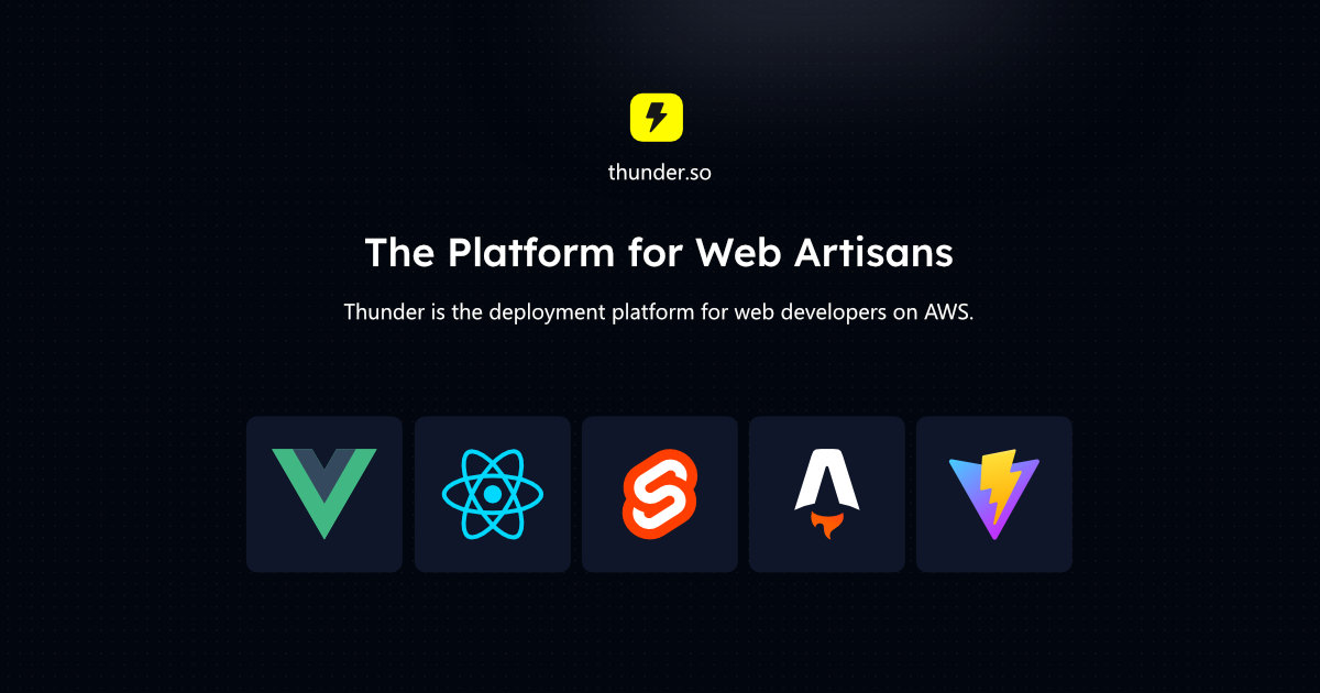 Thunder is a cloud deployment platform that enables you to effortlessly deploy your applications to AWS with minimal configuration. Whether you’re working with static sites, single-page applications, or complex web apps, Thunder simplifies the deployment pipeline, allowing you to focus on building great products rather than managing infrastructure.